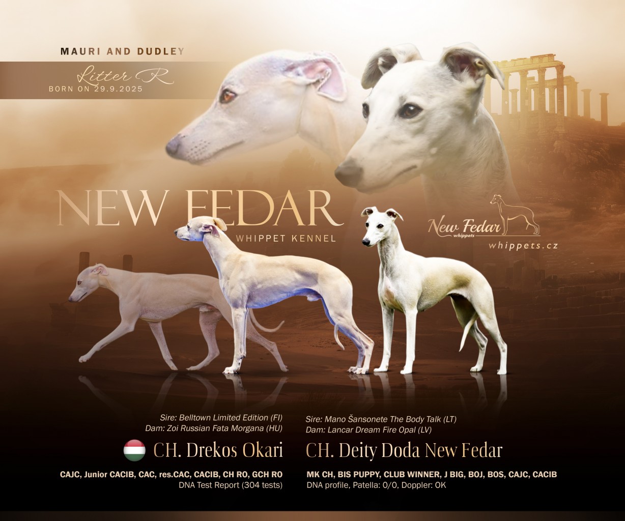 S radostí a velkou pokorou oznamujeme, že naše milovaná Dudley ( Deity Doda NF) bude mít svůj třetí a poslední vrh. Jako tatínka jsme, od jeho importu z Maďarska moc chtěli o jehož kvalitách nepochybujeme a moc se těšíme jací budou potomci po Drekos Okari. Maurís má velký (304) počet genetických testů, má černý pigment, má DNA test report a vyšetřené srdce. Jeho otcem je Finský pes, res.CACIB z letošní světové výstavy Belltown Limited Edition a matkou je fena z Maďarského chovu Zoi Russian Fata Morgana.